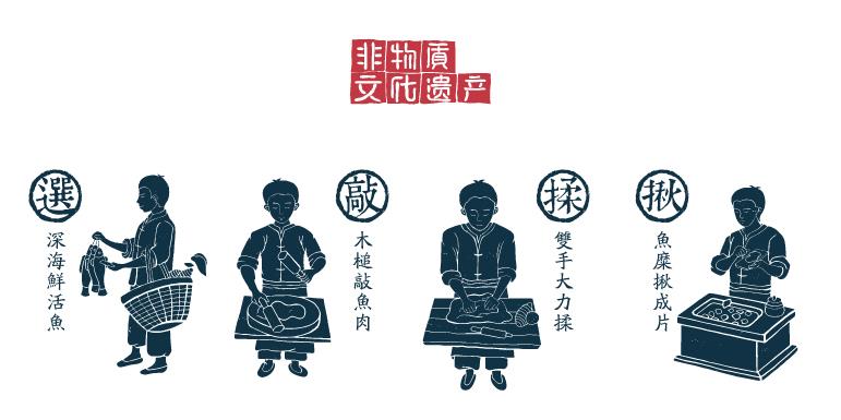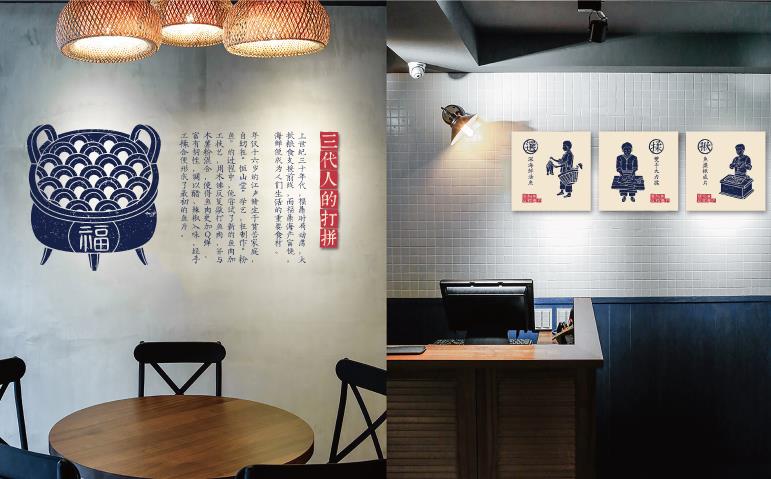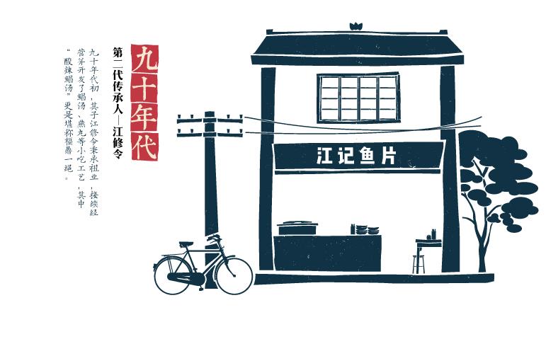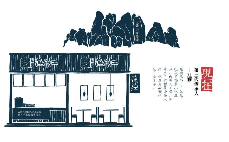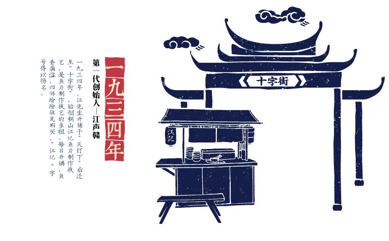 我们用版画的形式,描绘了江家三代人在不同的时代,从街头小摊,到江记鱼片,到现在的渔片江的历史沿革,斑驳质朴的笔触,浓浓的历史人文感跃然眼前。