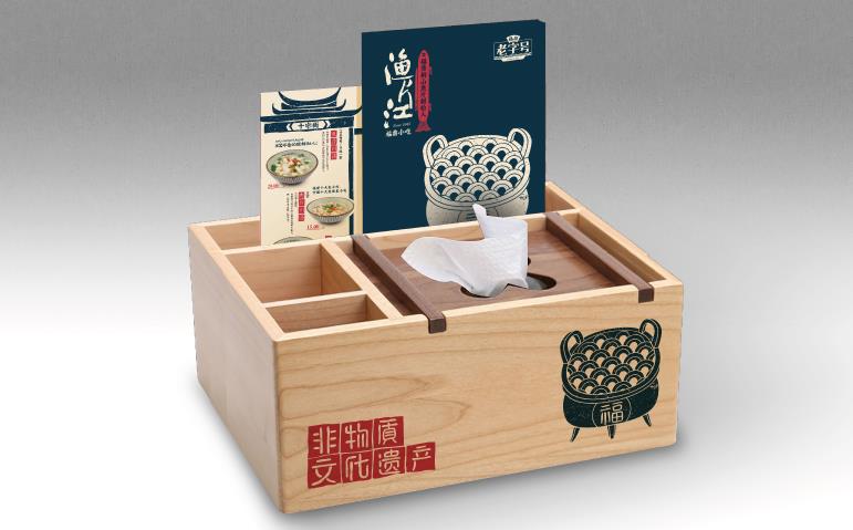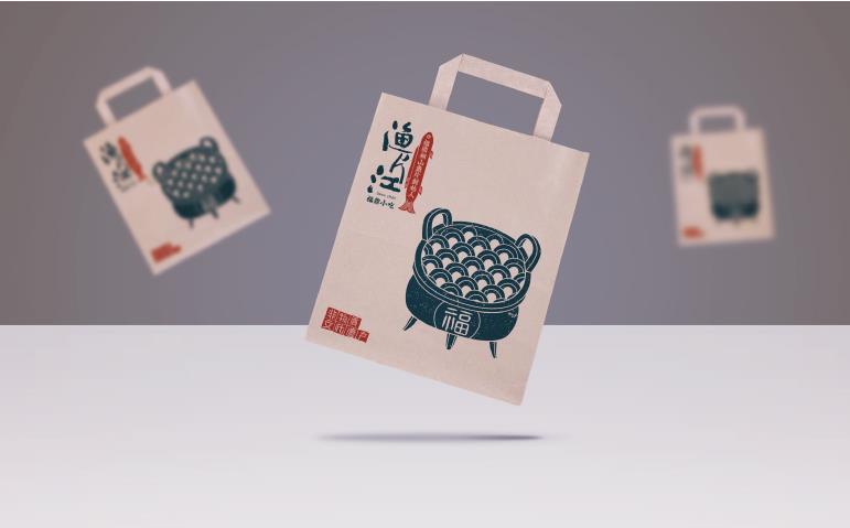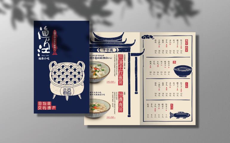 渔片江品牌的设计以蓝印花布和版画这两种艺术形式结合的视觉调性,向消费者传达出一种朴实的感觉,民间于是民间小吃的滋味从味觉到视觉形成了完美的统一。